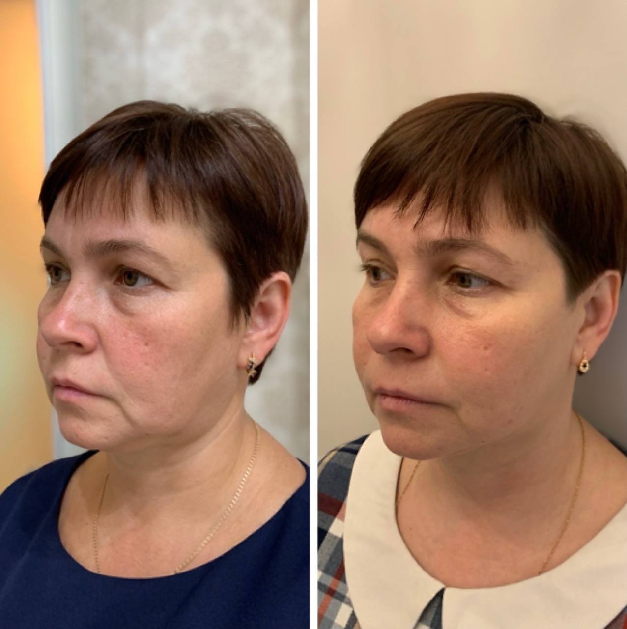 Лифтинговые нити механически подтягивают смещенные жировые пакеты из нижней трети обратно в скуловую область, восстанавливая молодой овал.